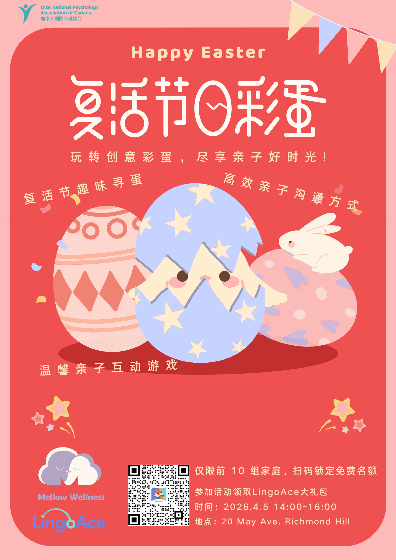 在这个充满生机与希望的四月,IPAC联合LingoAce与Mellow Wellness诚挚邀请您和您的孩子参与一场别开生面的复活节特别活动——“彩蛋寻欢乐,沟通暖童心”。这是一次难得的机会,让5-10岁的孩子们在充满趣味的活动中,不仅能体验到复活节的传统乐趣,更能与父母进行高质量的亲子互动,共同探索高效沟通的奥秘。