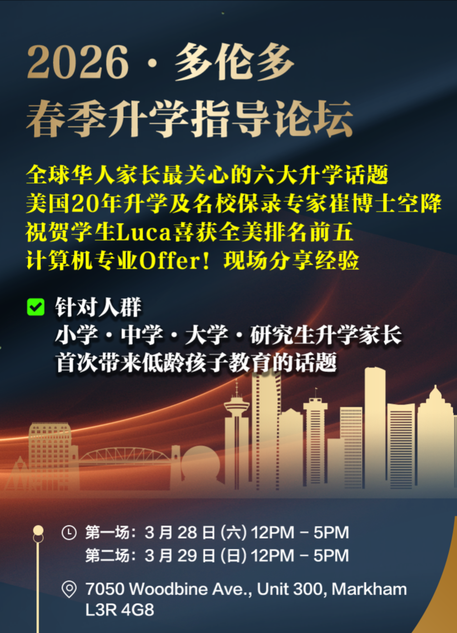 全球华人家长最关心的六大升学话题,美国20年升学及名校保录专家崔博士空降,祝贺学生Luca喜获全美排名前五计算机专业Offer! 现场分享经验,首次带来低龄孩子教育的话题。