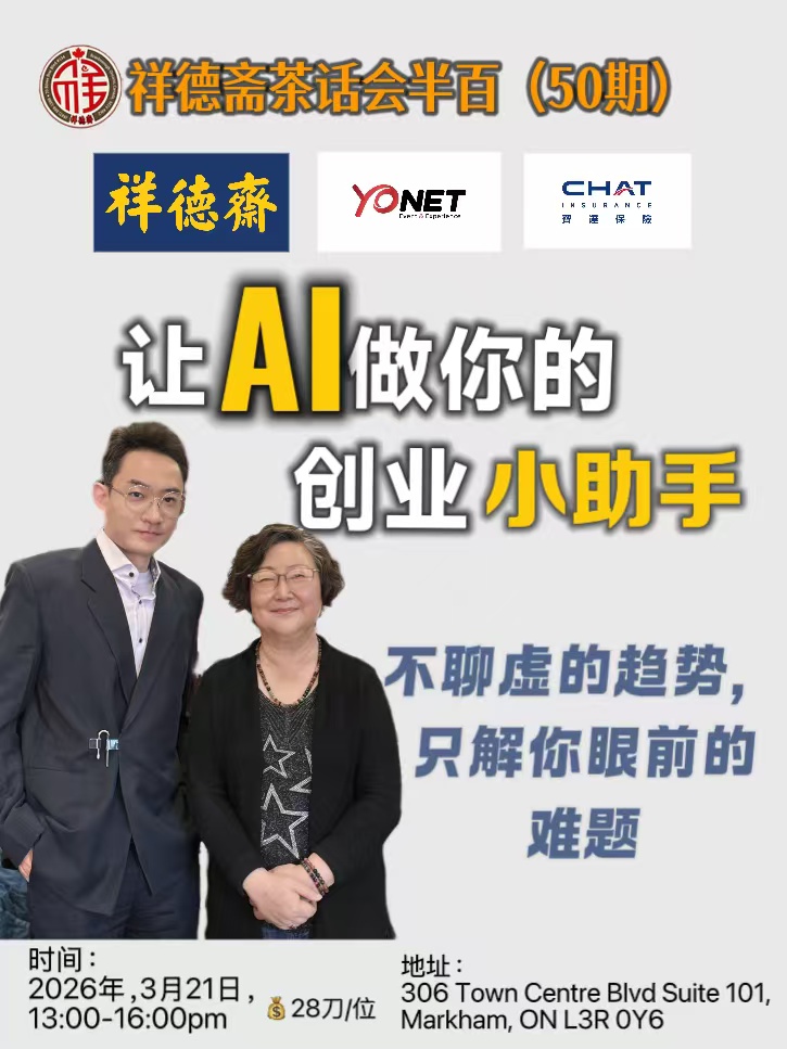 在当今快速发展的数字时代,人工智能(AI)已不再是遥不可及的科幻概念,而是深刻影响着各行各业的颠覆性力量。对于创业者而言,如何有效利用AI工具,将之转化为提升效率、优化决策、创造新商业模式的强大动力,已成为决定成败的关键。祥德斋茶话会,作为华人社区长期以来备受推崇的交流平台,秉承着务实、深入的理念,特地策划了这第50期,邀请业界专家,共同揭示AI赋能创业的奥秘。