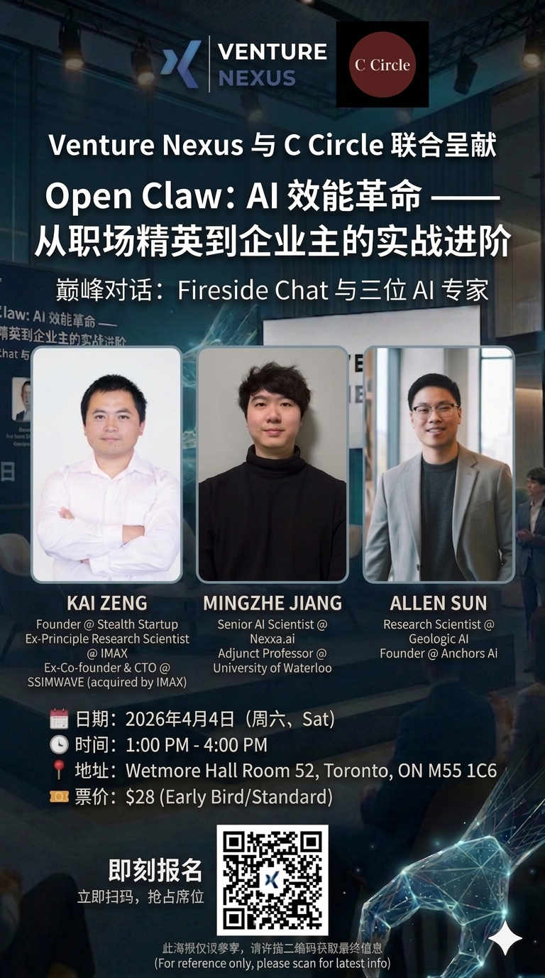 本次活动邀请三位具备科研、产业与创业背景的 AI 嘉宾共同参与。Kai Zeng 现为 Stealth Startup Founder,曾任 IMAX Principal Research Scientist,并曾担任 SSIMWAVE 联合创始人兼 CTO;Mingzhe Jiang 现为 Nexxa.ai Senior AI Scientist,同时担任 University of Waterloo Adjunct Professor;Allen Sun 现为 Geologic AI Research Scientist,同时也是 Anchors AI Founder。三位嘉宾将从不同视角展开对谈,带来更具现实意义的 AI 应用思考与行业观察。